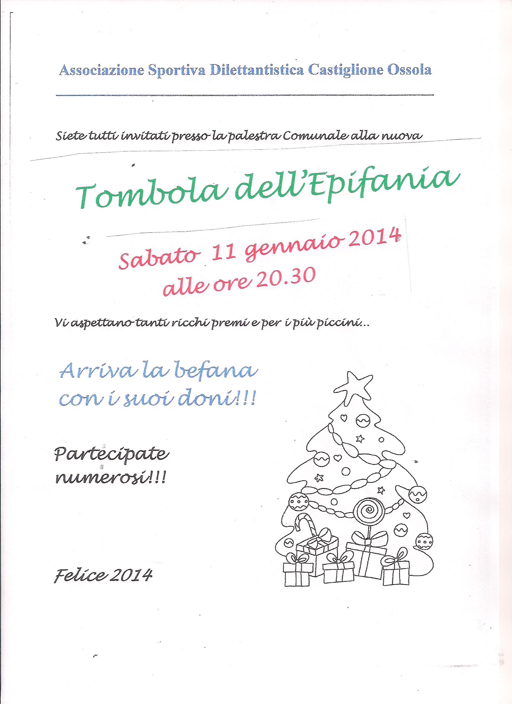 L'Associazione Sportiva Dilettantistica Castiglione Ossola organizza per sabato 11 gennaio 2014 ore 20.30 una Tombola come da volantino allegato.
