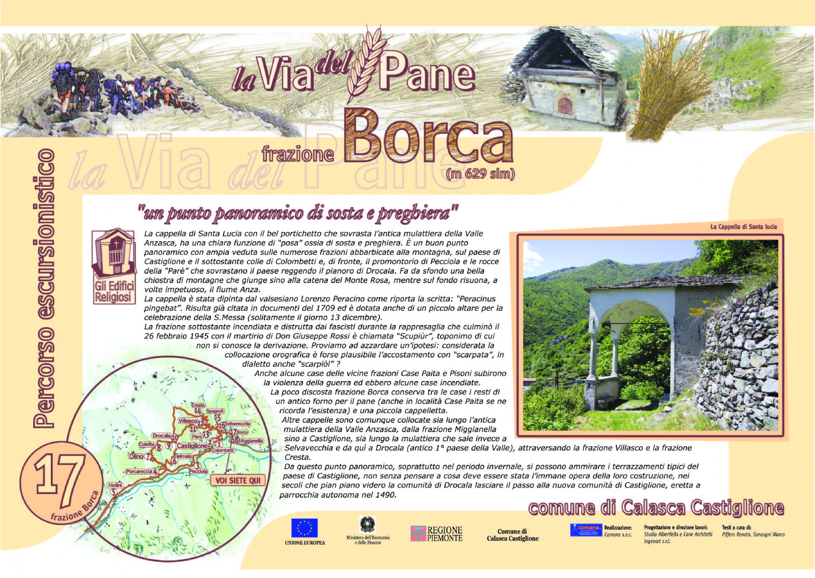 La cappella di Santa Lucia con il bel portichetto che sovrasta l'antica mulattiera della Valle Anzasca, ha una chiara funzione di "posa" ossia di sosta e preghiera. E un buon punto panoramico con ampia veduta sulle numerose frazioni abbarbicate alla montagna, sul paese di Casti glione e 11 sottostante colle di Colombetti e, di fronte, il promontorio di Pecciola e le rocce della "Parè" che sovrastano il paese reggendo il pianoro di Drocala.