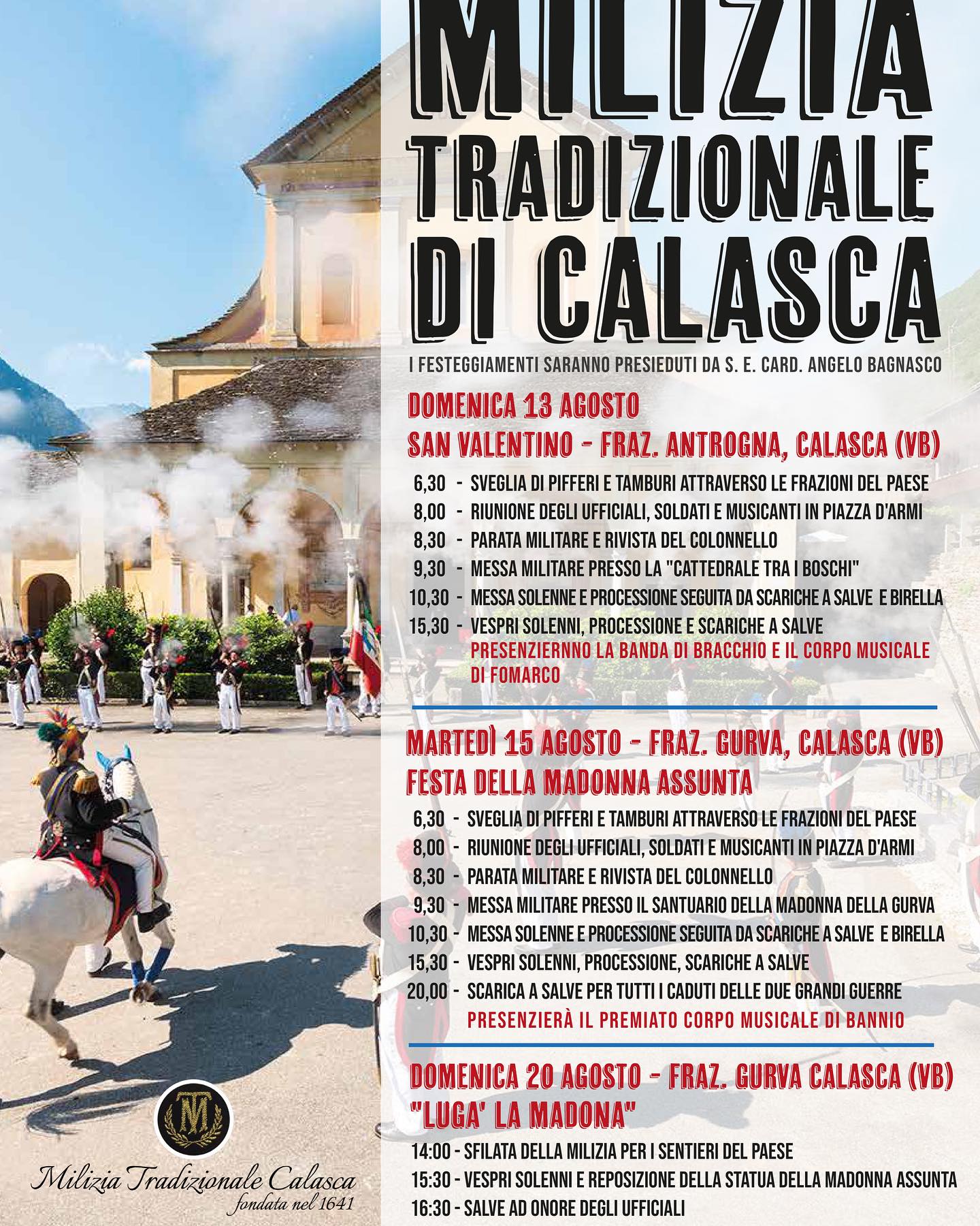Si pubblica locandina con gli orari delle rievocazioni storiche della Milizia Tradizionale di Calasca del 13 - 15 e 20 agosto 2023 in occasione dei festeggiamenti religiosi in onore di San Valentino Martire in località Antrogna e della Madonna delle Grazie in località Gurva.